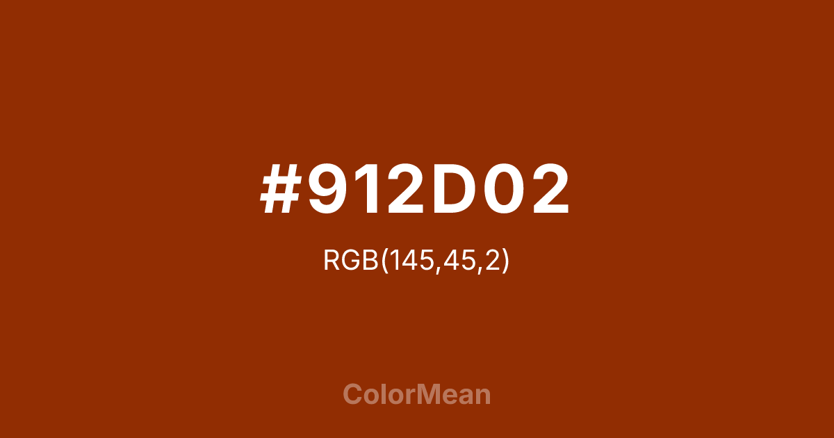 #912D02 RGB value is (145, 45, 2). The hex color red value is 145, green is 45, and blue is 2. Its HSL format shows a hue of 18°, saturation of 97 percent, and lightness of 29 percent. The CMYK process values are 0 percent, 69 percent, 99 percent, 43 percent.