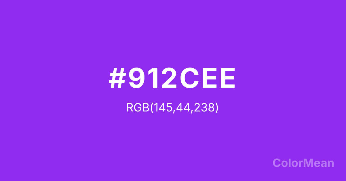 Purple2 (#912CEE) RGB value is (145, 44, 238). The hex color red value is 145, green is 44, and blue is 238. Its HSL format shows a hue of 271°, saturation of 85 percent, and lightness of 55 percent. The CMYK process values are 39 percent, 82 percent, 0 percent, 7 percent.