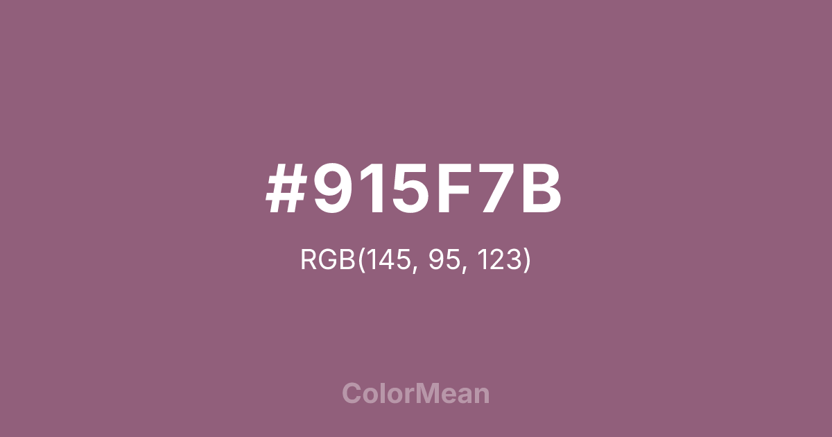 #915F7B RGB value is (145, 95, 123). The hex color red value is 145, green is 95, and blue is 123. Its HSL format shows a hue of 326°, saturation of 21 percent, and lightness of 47 percent. The CMYK process values are 0 percent, 34 percent, 15 percent, 43 percent.
