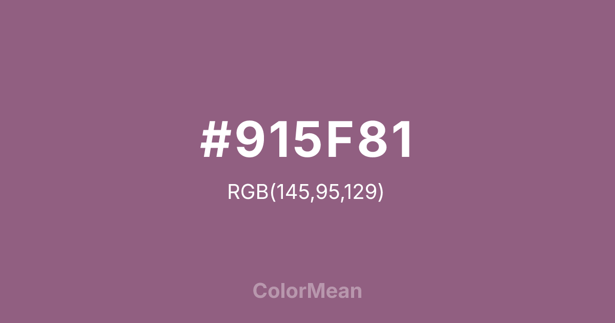 #915F81 RGB value is (145, 95, 129). The hex color red value is 145, green is 95, and blue is 129. Its HSL format shows a hue of 319°, saturation of 21 percent, and lightness of 47 percent. The CMYK process values are 0 percent, 34 percent, 11 percent, 43 percent.