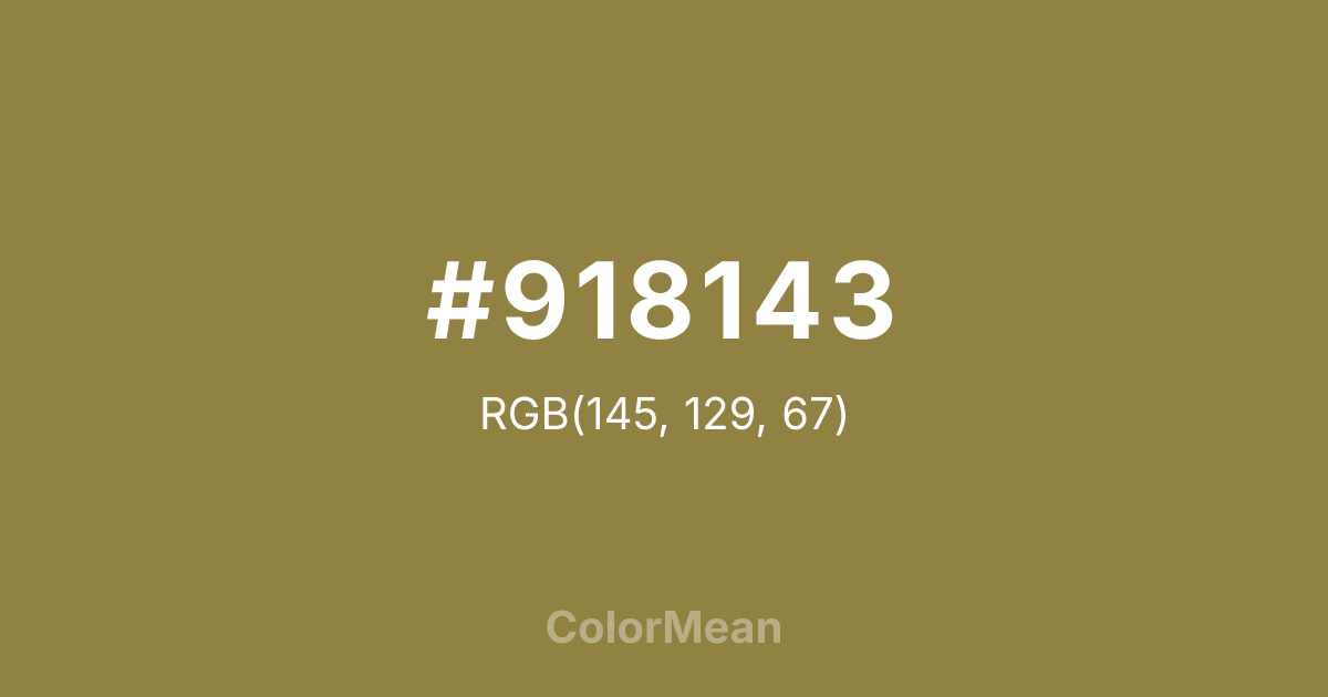 #918143 RGB value is (145, 129, 67). The hex color red value is 145, green is 129, and blue is 67. Its HSL format shows a hue of 48°, saturation of 37 percent, and lightness of 42 percent. The CMYK process values are 0 percent, 11 percent, 54 percent, 43 percent.