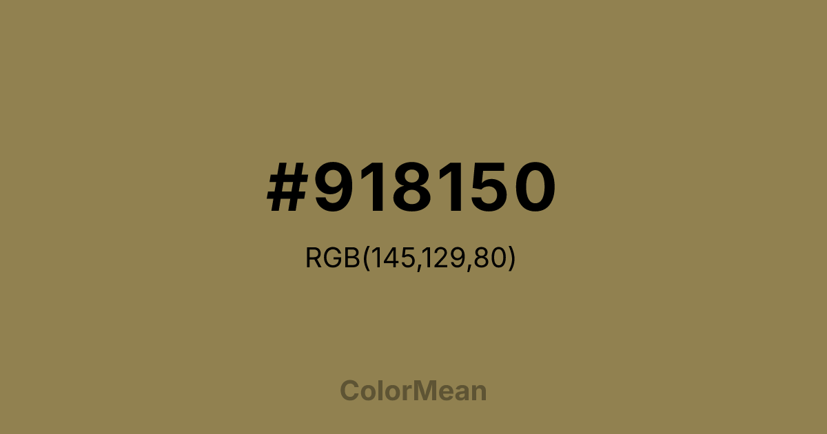 #918150 RGB value is (145, 129, 80). The hex color red value is 145, green is 129, and blue is 80. Its HSL format shows a hue of 45°, saturation of 29 percent, and lightness of 44 percent. The CMYK process values are 0 percent, 11 percent, 45 percent, 43 percent.