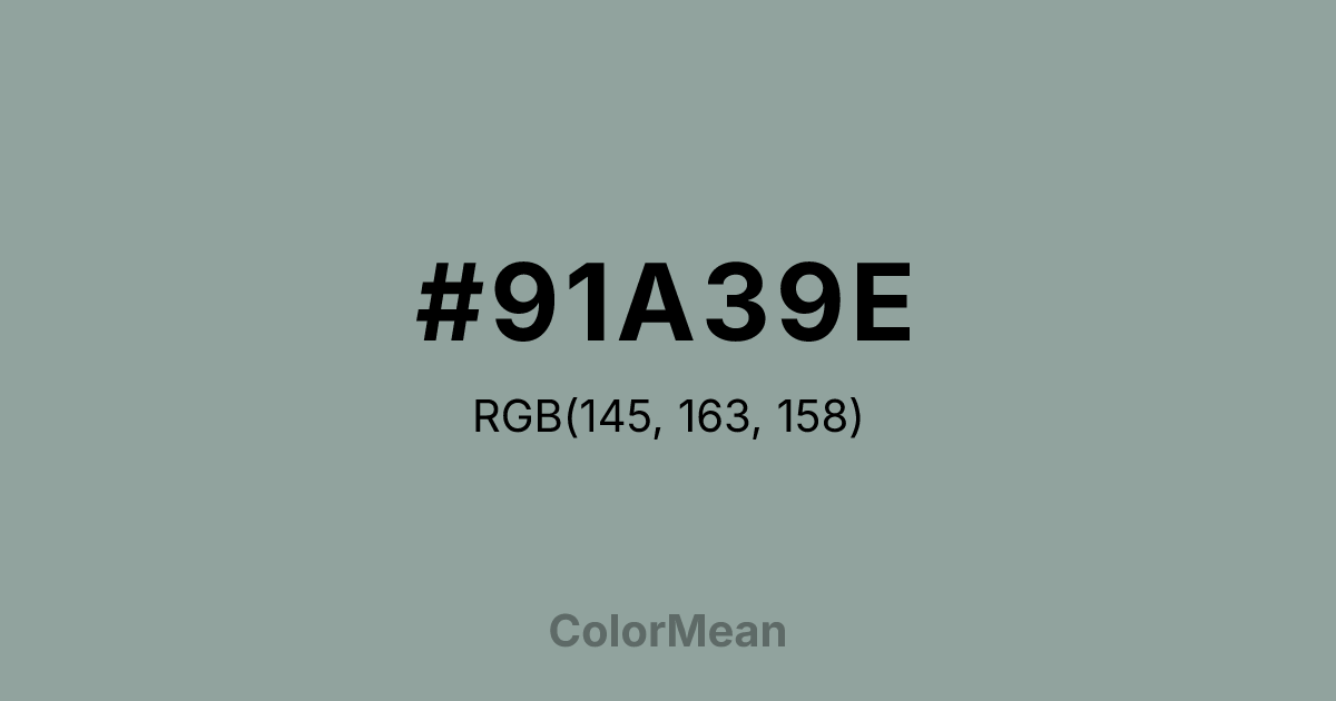 #91A39E RGB value is (145, 163, 158). The hex color red value is 145, green is 163, and blue is 158. Its HSL format shows a hue of 163°, saturation of 9 percent, and lightness of 60 percent. The CMYK process values are 11 percent, 0 percent, 3 percent, 36 percent.
