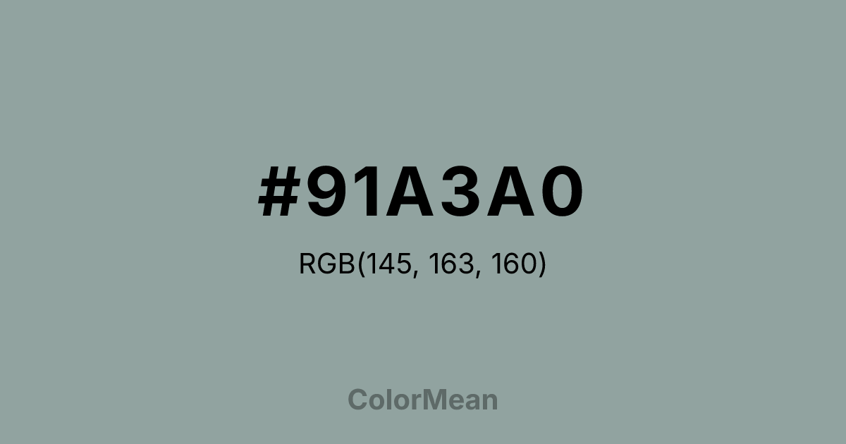 #91A3A0 RGB value is (145, 163, 160). The hex color red value is 145, green is 163, and blue is 160. Its HSL format shows a hue of 170°, saturation of 9 percent, and lightness of 60 percent. The CMYK process values are 11 percent, 0 percent, 2 percent, 36 percent.