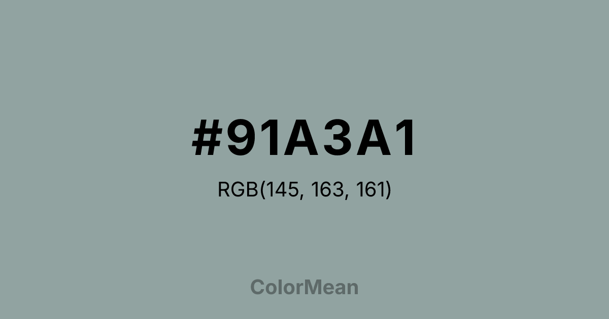 #91A3A1 RGB value is (145, 163, 161). The hex color red value is 145, green is 163, and blue is 161. Its HSL format shows a hue of 173°, saturation of 9 percent, and lightness of 60 percent. The CMYK process values are 11 percent, 0 percent, 1 percent, 36 percent.