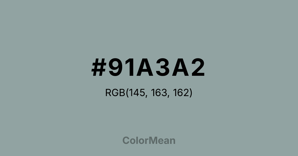 #91A3A2 RGB value is (145, 163, 162). The hex color red value is 145, green is 163, and blue is 162. Its HSL format shows a hue of 177°, saturation of 9 percent, and lightness of 60 percent. The CMYK process values are 11 percent, 0 percent, 1 percent, 36 percent.