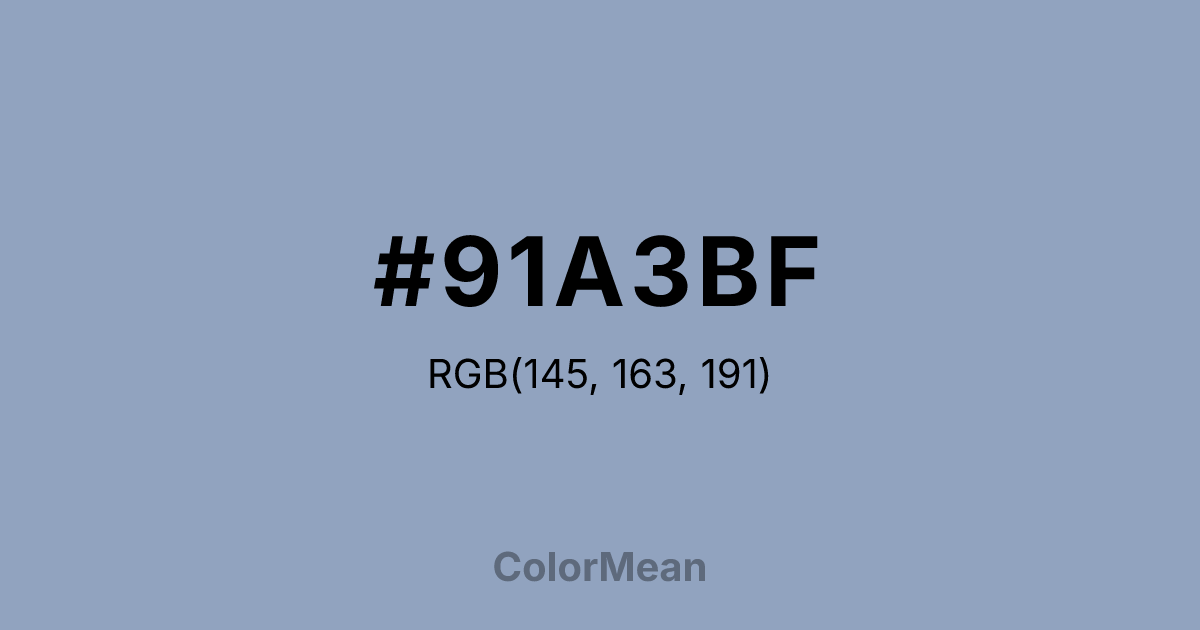 #91A3BF RGB value is (145, 163, 191). The hex color red value is 145, green is 163, and blue is 191. Its HSL format shows a hue of 217°, saturation of 26 percent, and lightness of 66 percent. The CMYK process values are 24 percent, 15 percent, 0 percent, 25 percent.
