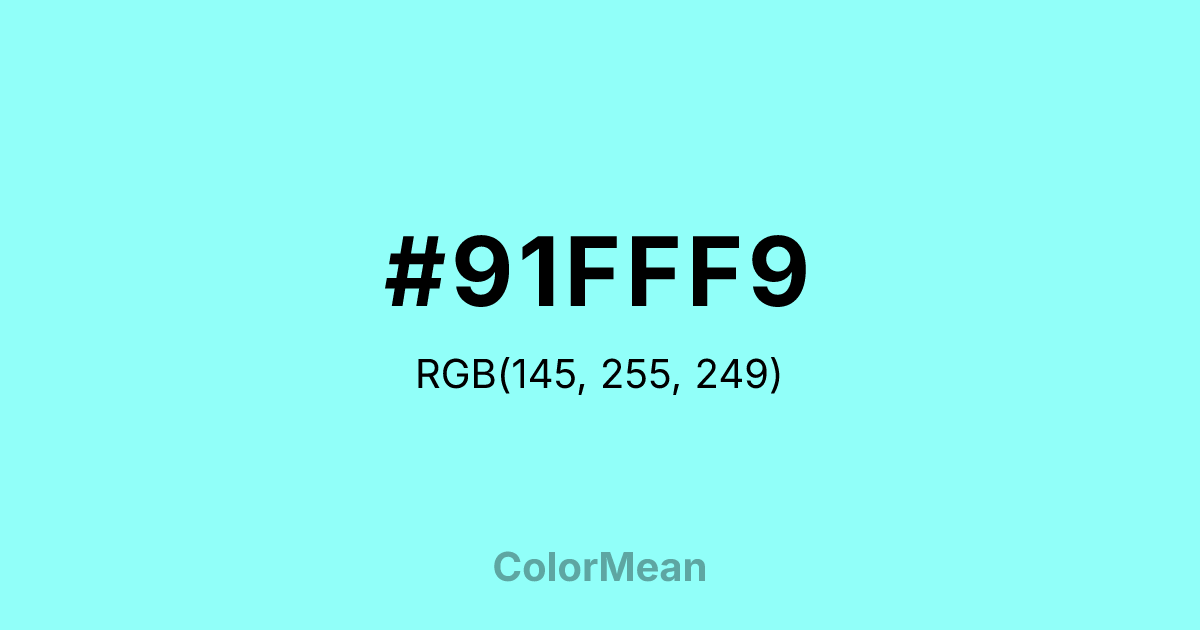 #91FFF9 RGB value is (145, 255, 249). The hex color red value is 145, green is 255, and blue is 249. Its HSL format shows a hue of 177°, saturation of 100 percent, and lightness of 78 percent. The CMYK process values are 43 percent, 0 percent, 2 percent, 0 percent.