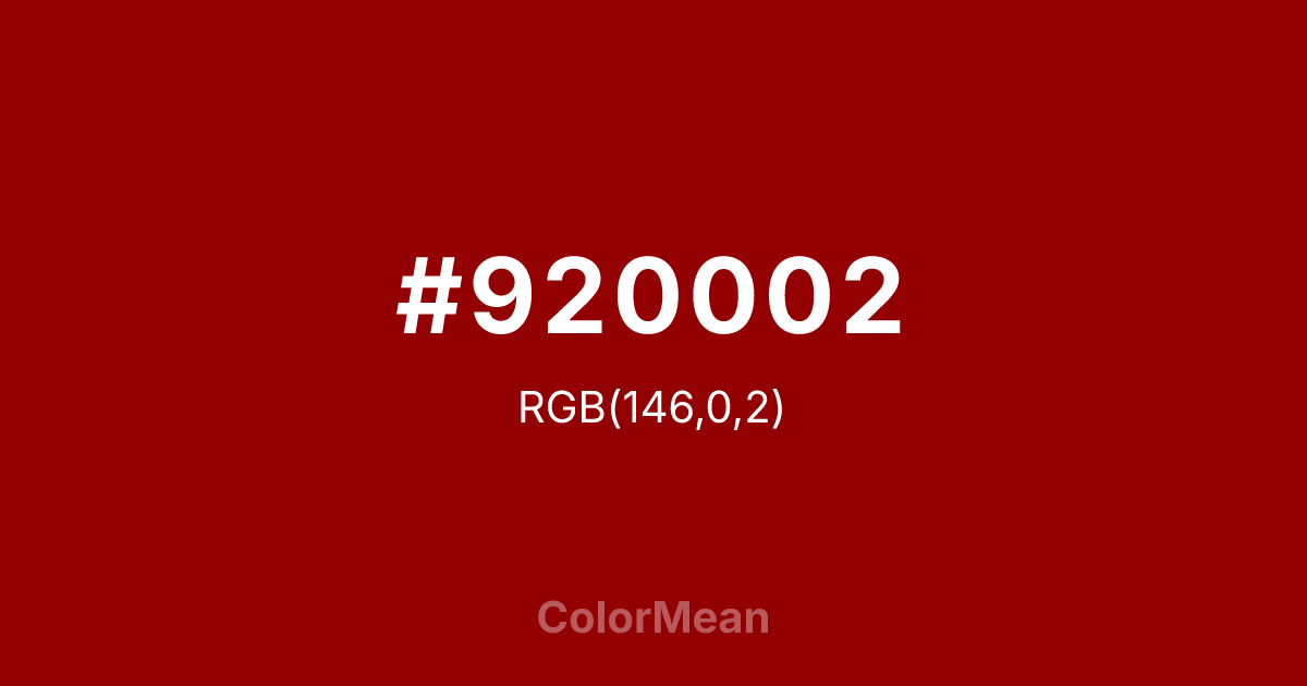 #920002 RGB value is (146, 0, 2). The hex color red value is 146, green is 0, and blue is 2. Its HSL format shows a hue of 359°, saturation of 100 percent, and lightness of 29 percent. The CMYK process values are 0 percent, 100 percent, 99 percent, 43 percent.