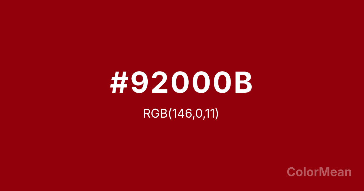 #92000B RGB value is (146, 0, 11). The hex color red value is 146, green is 0, and blue is 11. Its HSL format shows a hue of 355°, saturation of 100 percent, and lightness of 29 percent. The CMYK process values are 0 percent, 100 percent, 92 percent, 43 percent.