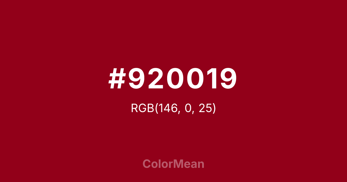 #920019 RGB value is (146, 0, 25). The hex color red value is 146, green is 0, and blue is 25. Its HSL format shows a hue of 350°, saturation of 100 percent, and lightness of 29 percent. The CMYK process values are 0 percent, 100 percent, 83 percent, 43 percent.