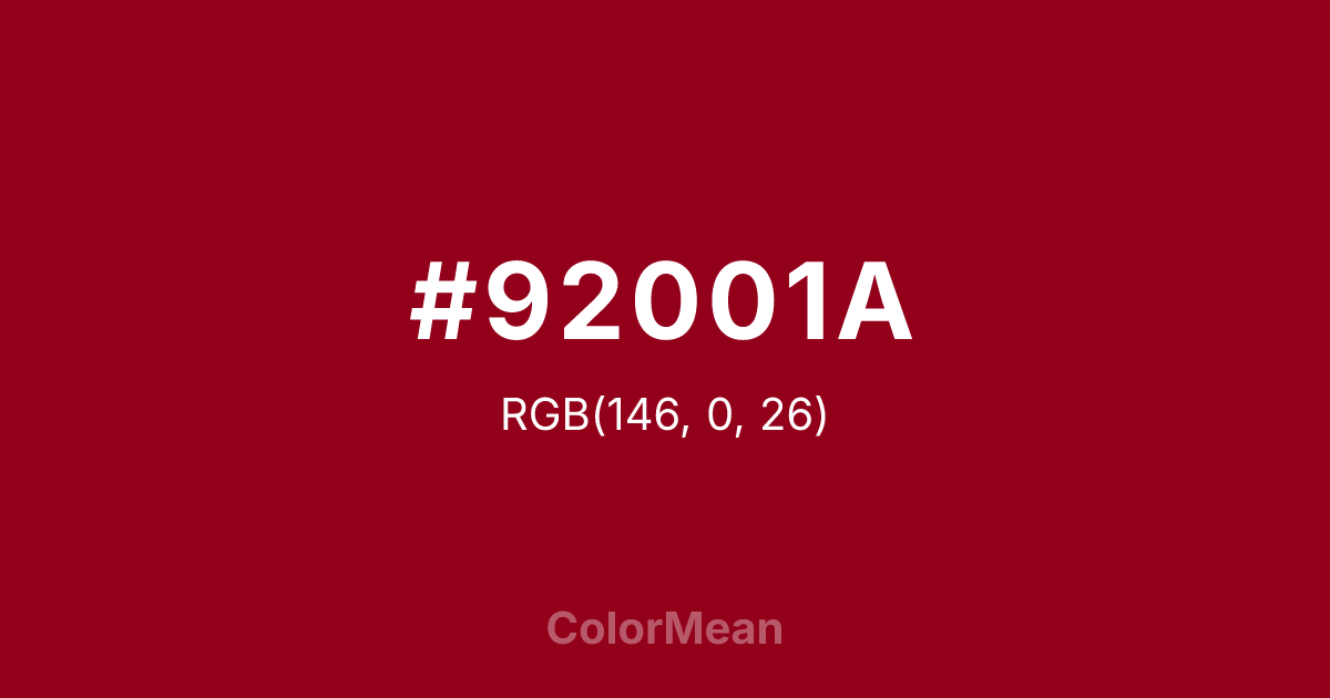 #92001A RGB value is (146, 0, 26). The hex color red value is 146, green is 0, and blue is 26. Its HSL format shows a hue of 349°, saturation of 100 percent, and lightness of 29 percent. The CMYK process values are 0 percent, 100 percent, 82 percent, 43 percent.