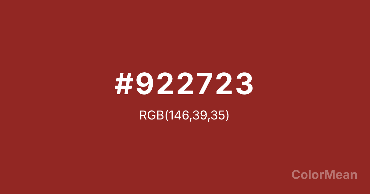 #922723 RGB value is (146, 39, 35). The hex color red value is 146, green is 39, and blue is 35. Its HSL format shows a hue of 2°, saturation of 61 percent, and lightness of 35 percent. The CMYK process values are 0 percent, 73 percent, 76 percent, 43 percent.