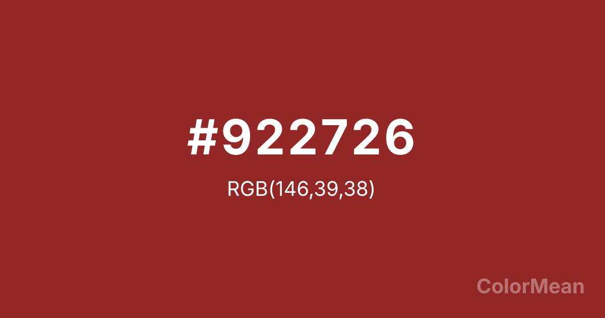 #922726 RGB value is (146, 39, 38). The hex color red value is 146, green is 39, and blue is 38. Its HSL format shows a hue of 1°, saturation of 59 percent, and lightness of 36 percent. The CMYK process values are 0 percent, 73 percent, 74 percent, 43 percent.