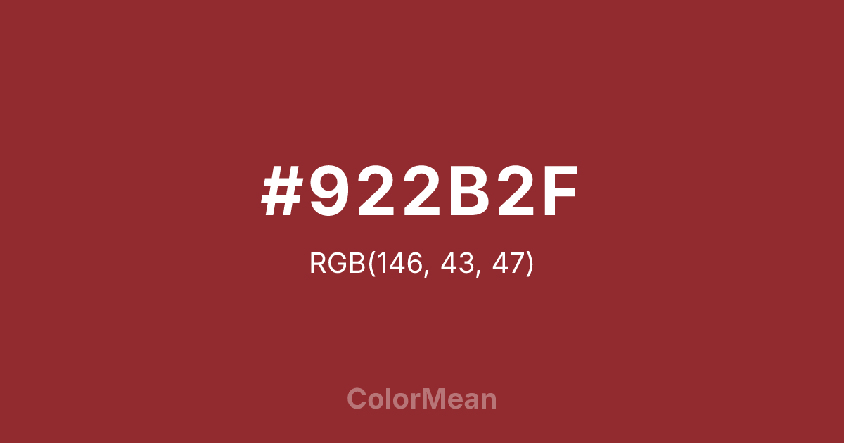 #922B2F RGB value is (146, 43, 47). The hex color red value is 146, green is 43, and blue is 47. Its HSL format shows a hue of 358°, saturation of 54 percent, and lightness of 37 percent. The CMYK process values are 0 percent, 71 percent, 68 percent, 43 percent.