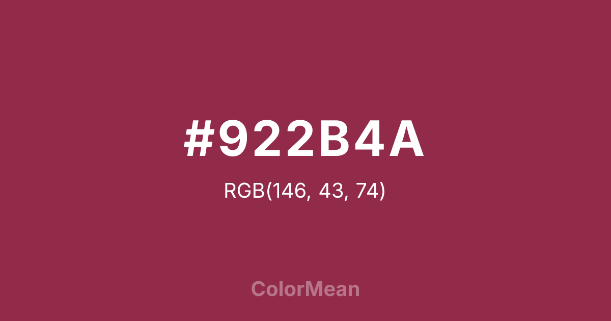 #922B4A RGB value is (146, 43, 74). The hex color red value is 146, green is 43, and blue is 74. Its HSL format shows a hue of 342°, saturation of 54 percent, and lightness of 37 percent. The CMYK process values are 0 percent, 71 percent, 49 percent, 43 percent.