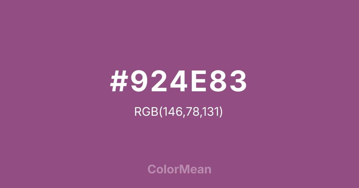 #924E83 RGB value is (146, 78, 131). The hex color red value is 146, green is 78, and blue is 131. Its HSL format shows a hue of 313°, saturation of 30 percent, and lightness of 44 percent. The CMYK process values are 0 percent, 47 percent, 10 percent, 43 percent.
