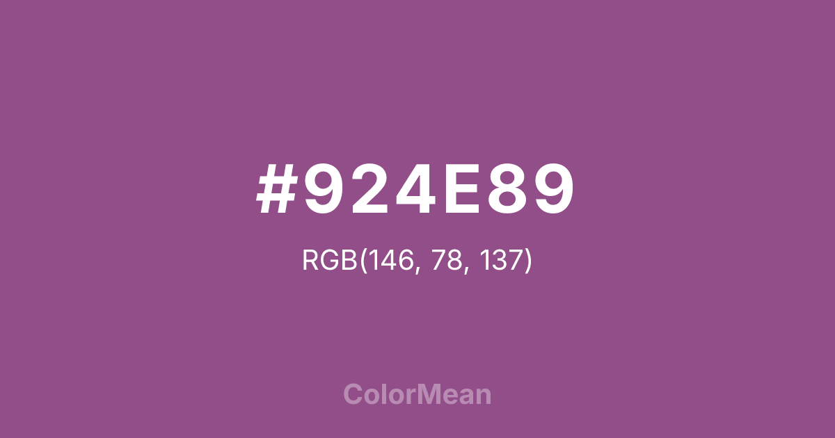#924E89 RGB value is (146, 78, 137). The hex color red value is 146, green is 78, and blue is 137. Its HSL format shows a hue of 308°, saturation of 30 percent, and lightness of 44 percent. The CMYK process values are 0 percent, 47 percent, 6 percent, 43 percent.