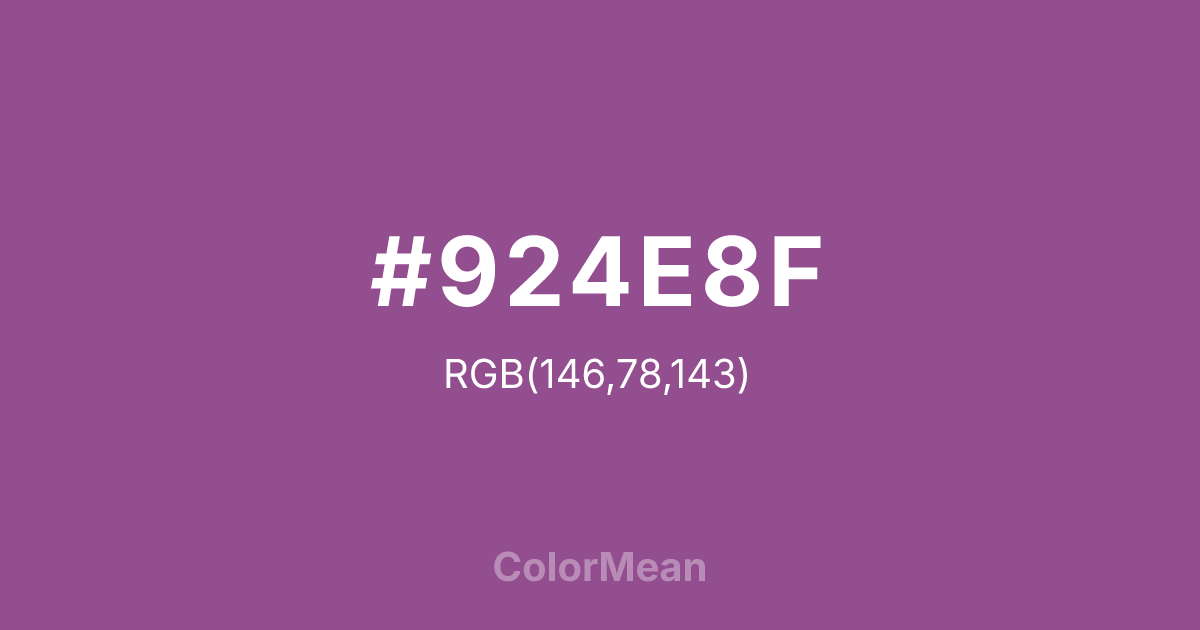 #924E8F RGB value is (146, 78, 143). The hex color red value is 146, green is 78, and blue is 143. Its HSL format shows a hue of 303°, saturation of 30 percent, and lightness of 44 percent. The CMYK process values are 0 percent, 47 percent, 2 percent, 43 percent.