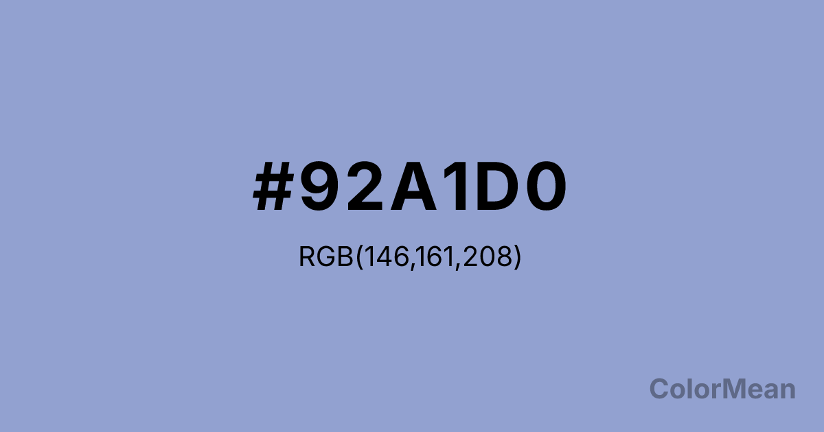 #92A1D0 RGB value is (146, 161, 208). The hex color red value is 146, green is 161, and blue is 208. Its HSL format shows a hue of 225°, saturation of 40 percent, and lightness of 69 percent. The CMYK process values are 30 percent, 23 percent, 0 percent, 18 percent.