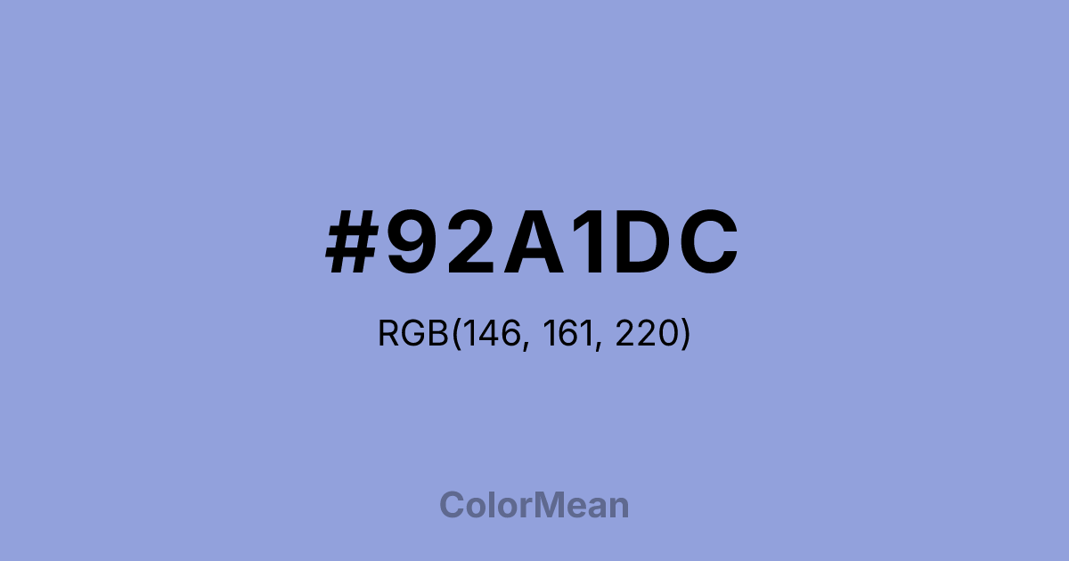 #92A1DC RGB value is (146, 161, 220). The hex color red value is 146, green is 161, and blue is 220. Its HSL format shows a hue of 228°, saturation of 51 percent, and lightness of 72 percent. The CMYK process values are 34 percent, 27 percent, 0 percent, 14 percent.
