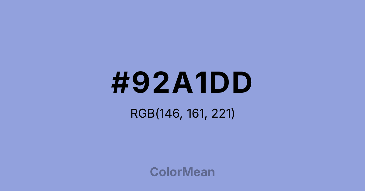 #92A1DD RGB value is (146, 161, 221). The hex color red value is 146, green is 161, and blue is 221. Its HSL format shows a hue of 228°, saturation of 52 percent, and lightness of 72 percent. The CMYK process values are 34 percent, 27 percent, 0 percent, 13 percent.