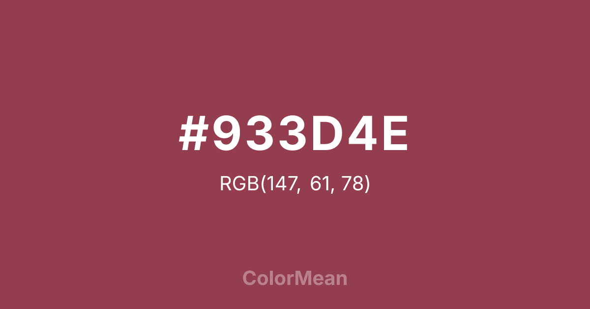 #933D4E RGB value is (147, 61, 78). The hex color red value is 147, green is 61, and blue is 78. Its HSL format shows a hue of 348°, saturation of 41 percent, and lightness of 41 percent. The CMYK process values are 0 percent, 59 percent, 47 percent, 42 percent.