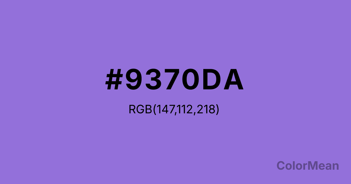 #9370DA RGB value is (147, 112, 218). The hex color red value is 147, green is 112, and blue is 218. Its HSL format shows a hue of 260°, saturation of 59 percent, and lightness of 65 percent. The CMYK process values are 33 percent, 49 percent, 0 percent, 15 percent.
