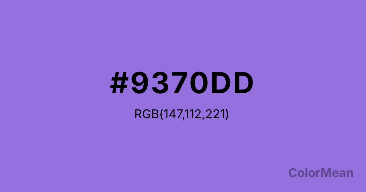 #9370DD RGB value is (147, 112, 221). The hex color red value is 147, green is 112, and blue is 221. Its HSL format shows a hue of 259°, saturation of 62 percent, and lightness of 65 percent. The CMYK process values are 33 percent, 49 percent, 0 percent, 13 percent.