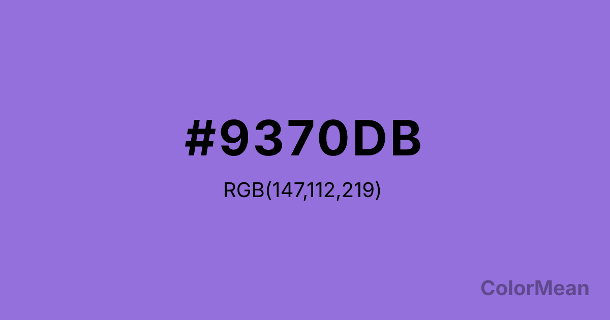 MediumPurple (#9370DB) RGB value is (147, 112, 219). The hex color red value is 147, green is 112, and blue is 219. Its HSL format shows a hue of 260°, saturation of 60 percent, and lightness of 65 percent. The CMYK process values are 33 percent, 49 percent, 0 percent, 14 percent.