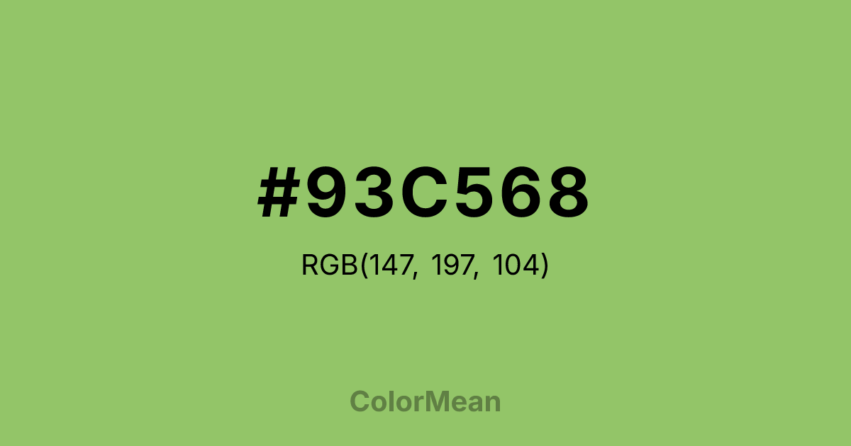 #93C568 RGB value is (147, 197, 104). The hex color red value is 147, green is 197, and blue is 104. Its HSL format shows a hue of 92°, saturation of 44 percent, and lightness of 59 percent. The CMYK process values are 25 percent, 0 percent, 47 percent, 23 percent.