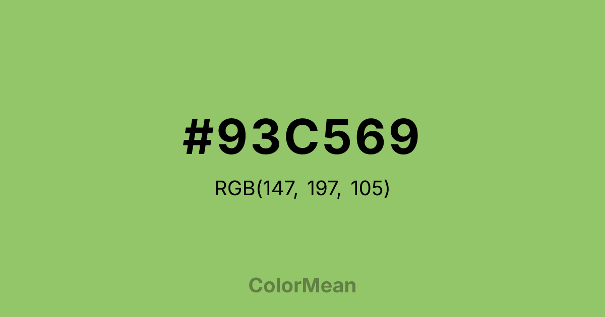 #93C569 RGB value is (147, 197, 105). The hex color red value is 147, green is 197, and blue is 105. Its HSL format shows a hue of 93°, saturation of 44 percent, and lightness of 59 percent. The CMYK process values are 25 percent, 0 percent, 47 percent, 23 percent.