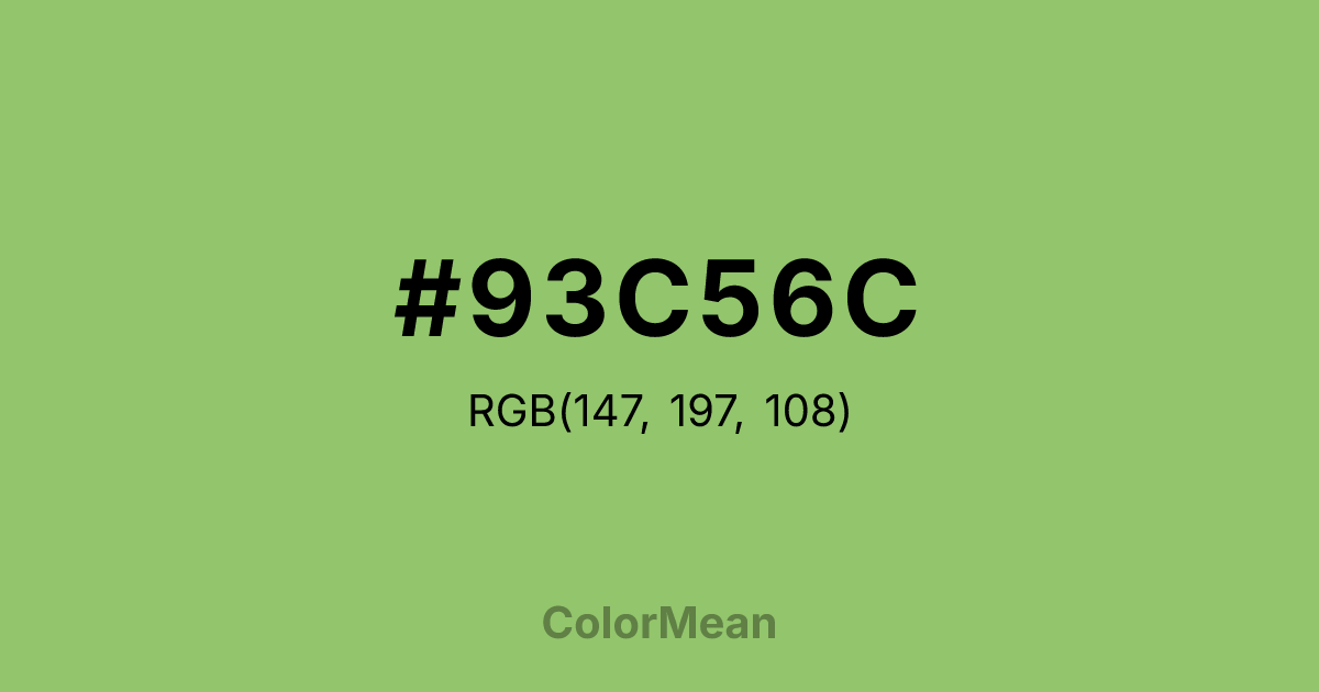 #93C56C RGB value is (147, 197, 108). The hex color red value is 147, green is 197, and blue is 108. Its HSL format shows a hue of 94°, saturation of 43 percent, and lightness of 60 percent. The CMYK process values are 25 percent, 0 percent, 45 percent, 23 percent.