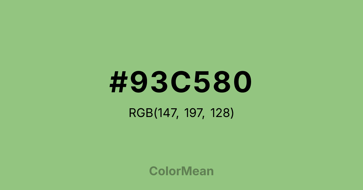 #93C580 RGB value is (147, 197, 128). The hex color red value is 147, green is 197, and blue is 128. Its HSL format shows a hue of 103°, saturation of 37 percent, and lightness of 64 percent. The CMYK process values are 25 percent, 0 percent, 35 percent, 23 percent.
