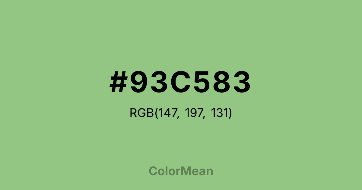 #93C583 RGB value is (147, 197, 131). The hex color red value is 147, green is 197, and blue is 131. Its HSL format shows a hue of 105°, saturation of 36 percent, and lightness of 64 percent. The CMYK process values are 25 percent, 0 percent, 34 percent, 23 percent.
