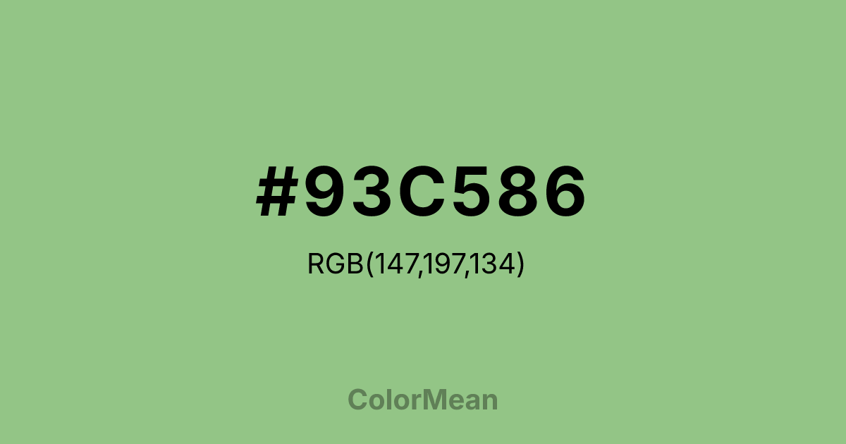 #93C586 RGB value is (147, 197, 134). The hex color red value is 147, green is 197, and blue is 134. Its HSL format shows a hue of 108°, saturation of 35 percent, and lightness of 65 percent. The CMYK process values are 25 percent, 0 percent, 32 percent, 23 percent.
