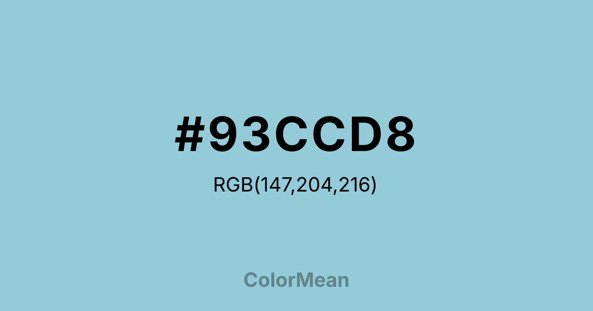 #93CCD8 RGB value is (147, 204, 216). The hex color red value is 147, green is 204, and blue is 216. Its HSL format shows a hue of 190°, saturation of 47 percent, and lightness of 71 percent. The CMYK process values are 32 percent, 6 percent, 0 percent, 15 percent.