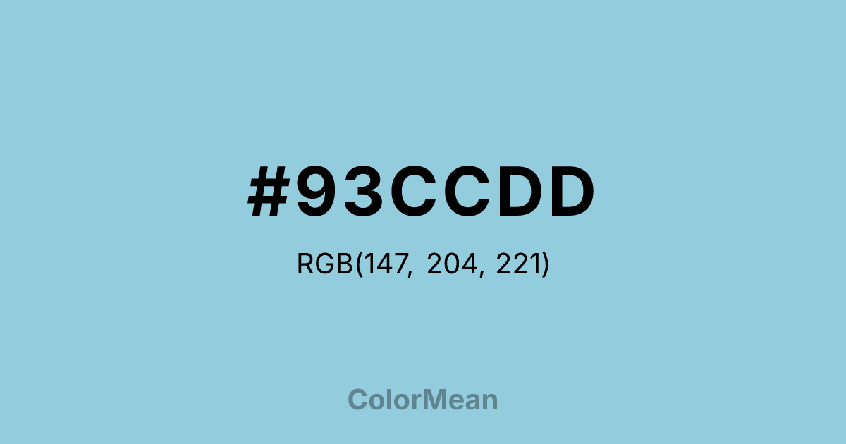 #93CCDD RGB value is (147, 204, 221). The hex color red value is 147, green is 204, and blue is 221. Its HSL format shows a hue of 194°, saturation of 52 percent, and lightness of 72 percent. The CMYK process values are 33 percent, 8 percent, 0 percent, 13 percent.