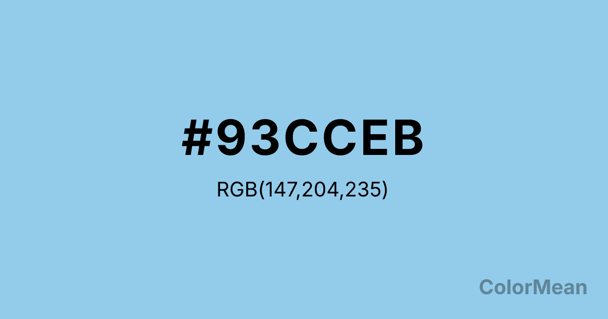 #93CCEB RGB value is (147, 204, 235). The hex color red value is 147, green is 204, and blue is 235. Its HSL format shows a hue of 201°, saturation of 69 percent, and lightness of 75 percent. The CMYK process values are 37 percent, 13 percent, 0 percent, 8 percent.