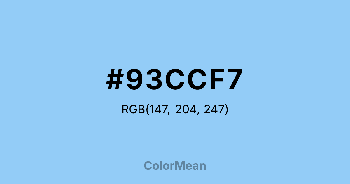 #93CCF7 RGB value is (147, 204, 247). The hex color red value is 147, green is 204, and blue is 247. Its HSL format shows a hue of 206°, saturation of 86 percent, and lightness of 77 percent. The CMYK process values are 40 percent, 17 percent, 0 percent, 3 percent.
