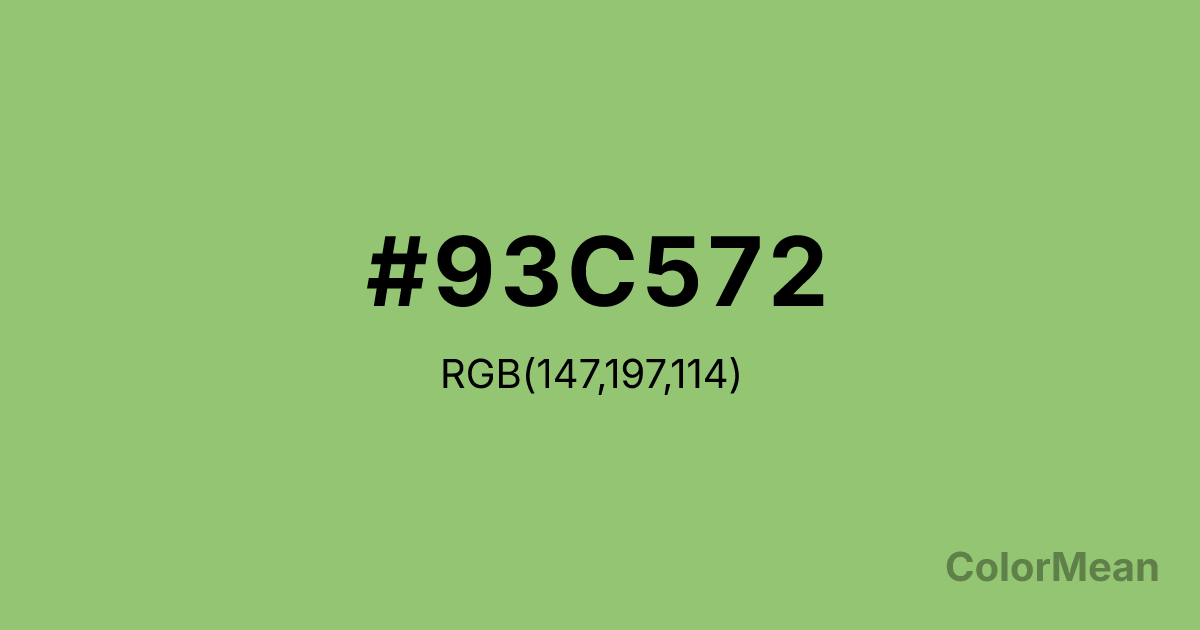 Pistachio (#93C572) RGB value is (147, 197, 114). The hex color red value is 147, green is 197, and blue is 114. Its HSL format shows a hue of 96°, saturation of 42 percent, and lightness of 61 percent. The CMYK process values are 25 percent, 0 percent, 42 percent, 23 percent.