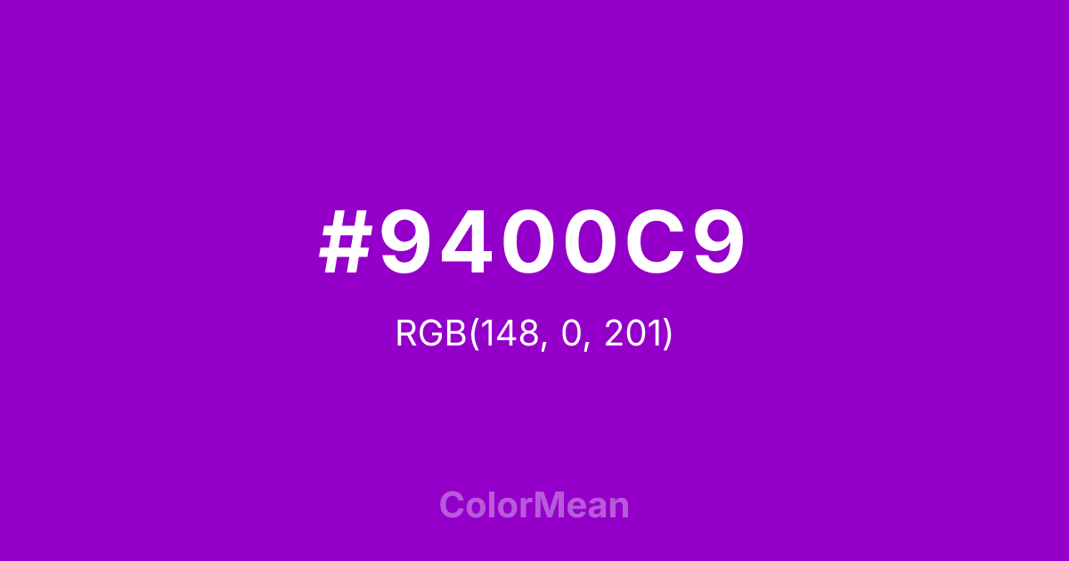#9400C9 RGB value is (148, 0, 201). The hex color red value is 148, green is 0, and blue is 201. Its HSL format shows a hue of 284°, saturation of 100 percent, and lightness of 39 percent. The CMYK process values are 26 percent, 100 percent, 0 percent, 21 percent.