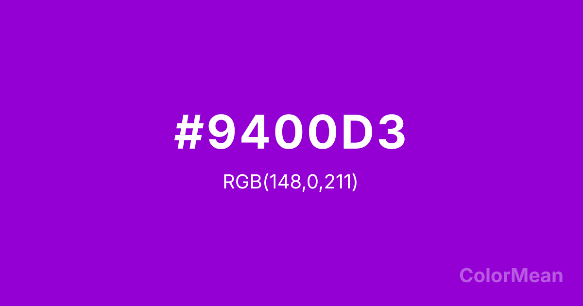 DarkViolet (#9400D3) RGB value is (148, 0, 211). The hex color red value is 148, green is 0, and blue is 211. Its HSL format shows a hue of 282°, saturation of 100 percent, and lightness of 41 percent. The CMYK process values are 30 percent, 100 percent, 0 percent, 17 percent.