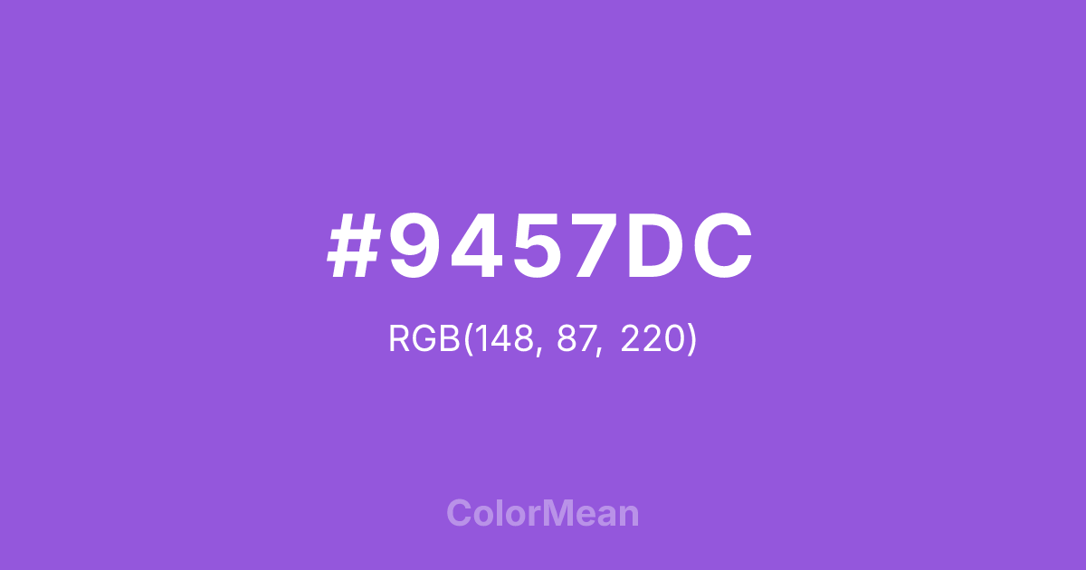 #9457DC RGB value is (148, 87, 220). The hex color red value is 148, green is 87, and blue is 220. Its HSL format shows a hue of 268°, saturation of 66 percent, and lightness of 60 percent. The CMYK process values are 33 percent, 60 percent, 0 percent, 14 percent.
