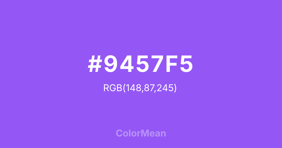 #9457F5 RGB value is (148, 87, 245). The hex color red value is 148, green is 87, and blue is 245. Its HSL format shows a hue of 263°, saturation of 89 percent, and lightness of 65 percent. The CMYK process values are 40 percent, 64 percent, 0 percent, 4 percent.