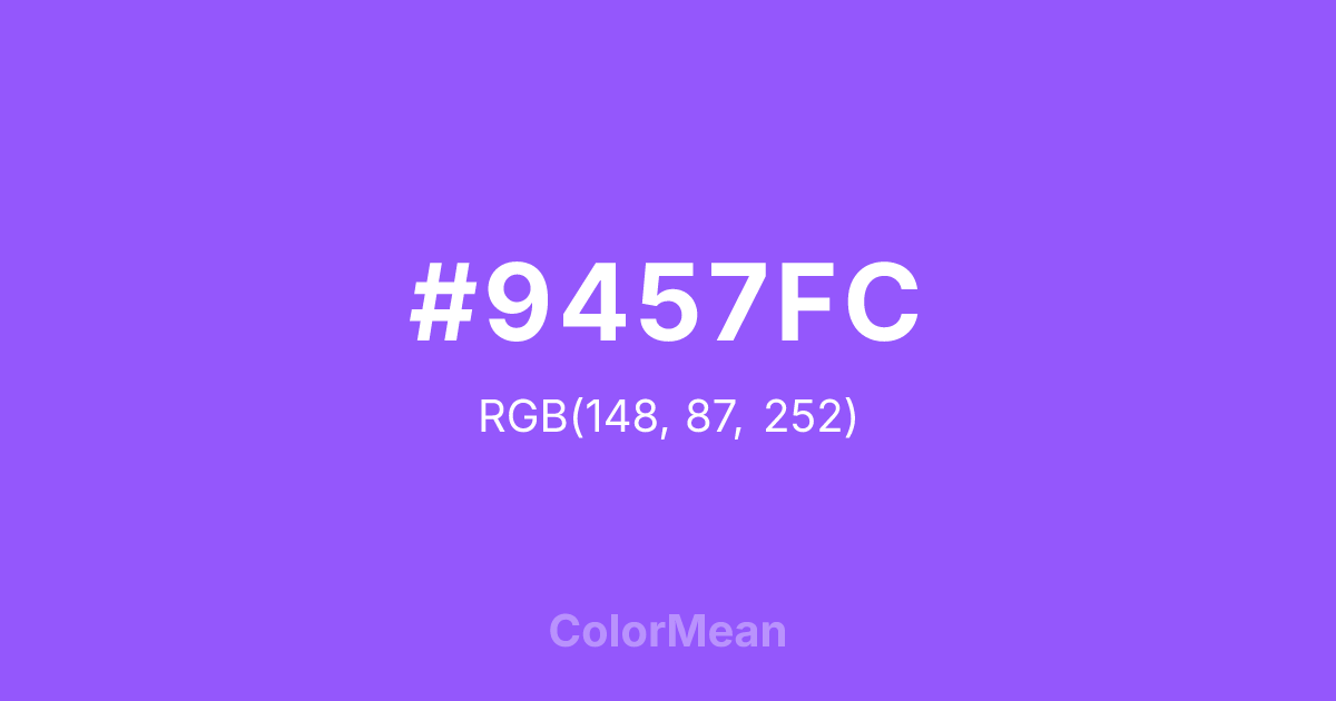 #9457FC RGB value is (148, 87, 252). The hex color red value is 148, green is 87, and blue is 252. Its HSL format shows a hue of 262°, saturation of 96 percent, and lightness of 66 percent. The CMYK process values are 41 percent, 65 percent, 0 percent, 1 percent.