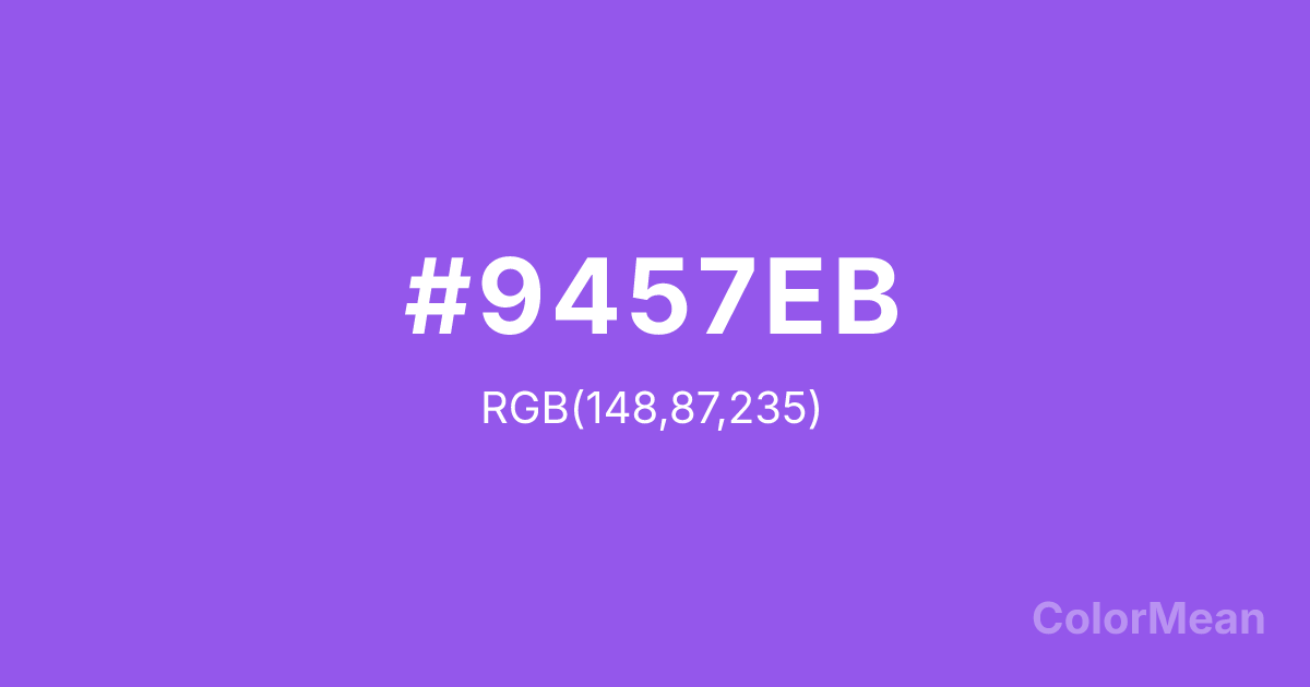 Navy Purple (#9457EB) RGB value is (148, 87, 235). The hex color red value is 148, green is 87, and blue is 235. Its HSL format shows a hue of 265°, saturation of 79 percent, and lightness of 63 percent. The CMYK process values are 37 percent, 63 percent, 0 percent, 8 percent.