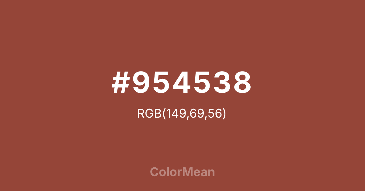 #954538 RGB value is (149, 69, 56). The hex color red value is 149, green is 69, and blue is 56. Its HSL format shows a hue of 8°, saturation of 45 percent, and lightness of 40 percent. The CMYK process values are 0 percent, 54 percent, 62 percent, 42 percent.