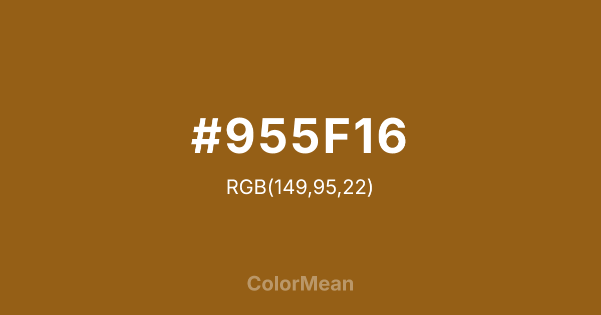 #955F16 RGB value is (149, 95, 22). The hex color red value is 149, green is 95, and blue is 22. Its HSL format shows a hue of 34°, saturation of 74 percent, and lightness of 34 percent. The CMYK process values are 0 percent, 36 percent, 85 percent, 42 percent.