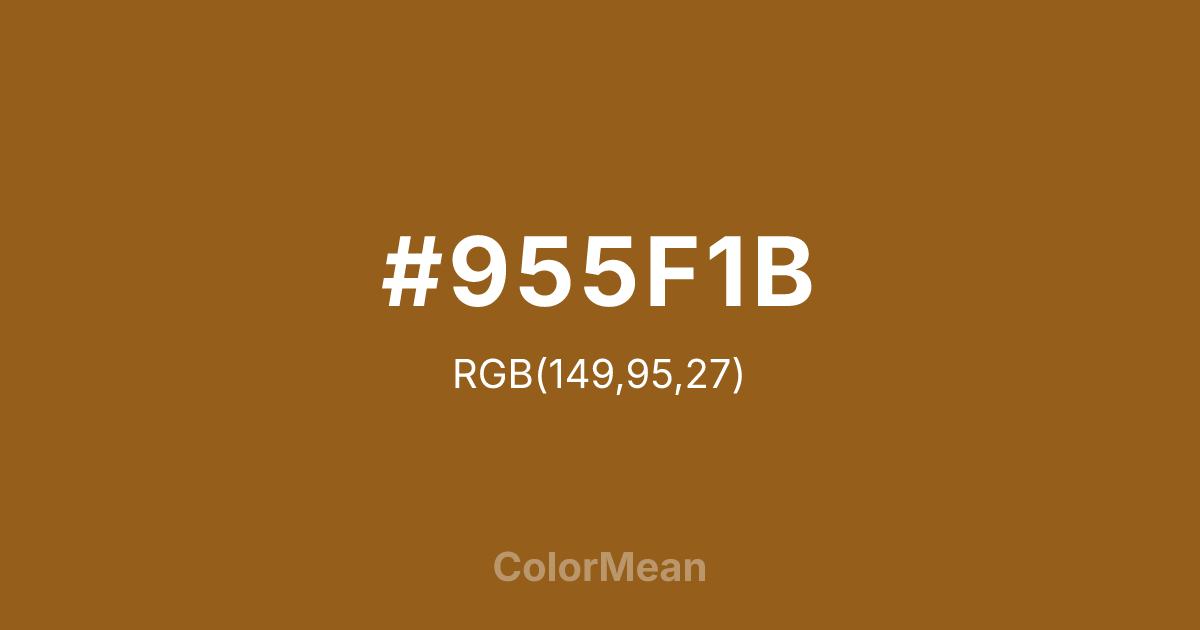 #955F1B RGB value is (149, 95, 27). The hex color red value is 149, green is 95, and blue is 27. Its HSL format shows a hue of 33°, saturation of 69 percent, and lightness of 35 percent. The CMYK process values are 0 percent, 36 percent, 82 percent, 42 percent.